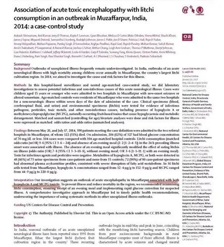 [1] Shrivastava, A. et al . Association of acute toxic encephalopathy with litchi consumption in an outbreak in Muzaffarpur, India, 2014: a case-control study. Lancet Glob. Hlth. (2017)