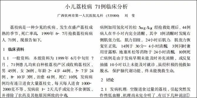 这个研究于 2000 年发表在《广西医学》杂志上,分析了「 1999 年 6 月中旬至 7 月,71 例来自种植荔枝产区或荔枝收购区的患儿」,最终这些患儿「治愈 61 例,死亡 10 例」,死亡原因是「未能及时处理或就诊」。