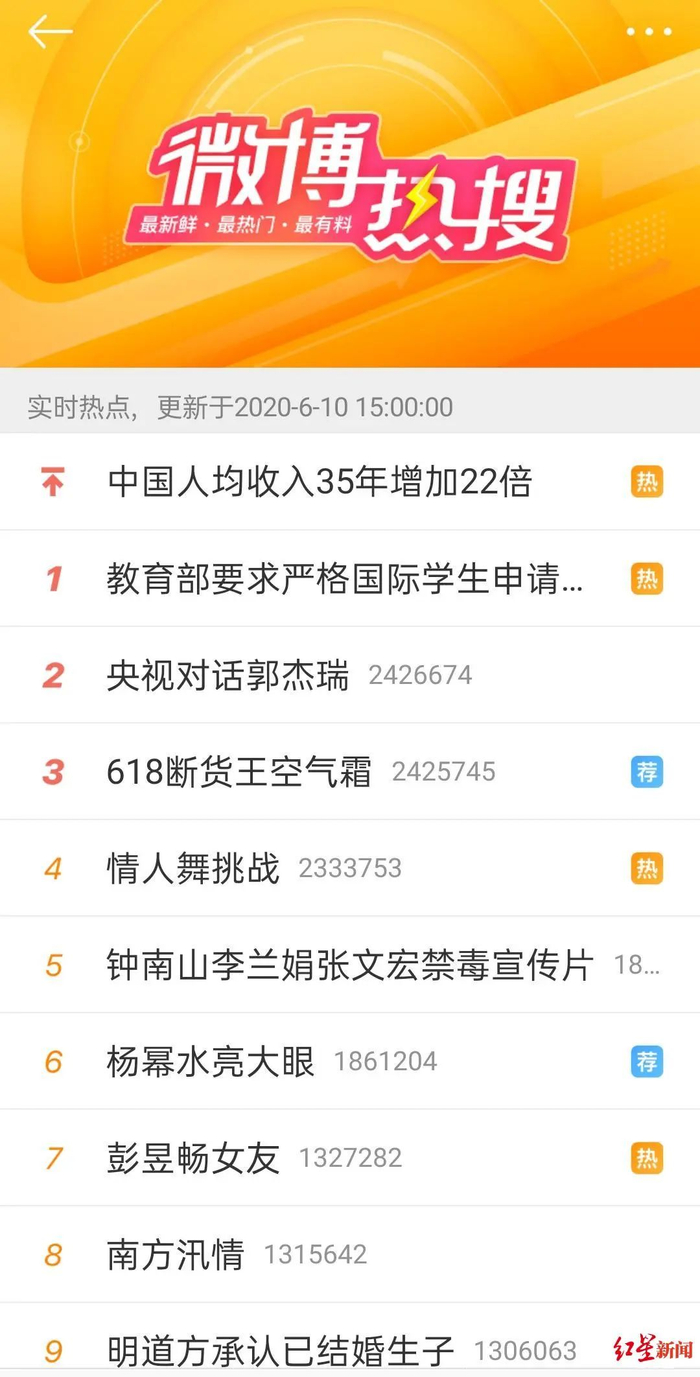 微博热搜一直以来就是娱乐八卦、明星拼人气的“重灾区”。在6月10日下午3点暂停的微博热搜中,排名前十的热搜中,就有4个和明星艺人有关,分别是#情人舞挑战#、#杨幂水亮大眼#、#彭昱畅女友#、#明道方已承认结婚生子#。