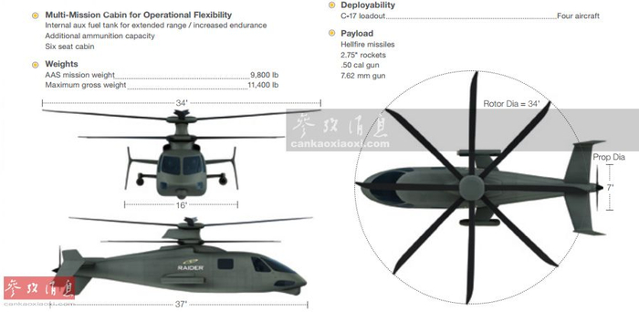 S-97“突袭者”由西科斯基公司基于X2高速直升机改进而来,于2015年5月成功首飞,其沿用了X2独有的“共轴双旋翼+后机身推进式螺旋桨”复合动力布局,最大飞行速度超过480千米 小时,是现役“黑鹰”直升机的2倍,“阿帕奇”武直的1.5倍。S-97全机长11米,主旋翼直径10米,由于机身大量采用复合材料,最大起飞重量仅4.9吨。图为S-97三视图。