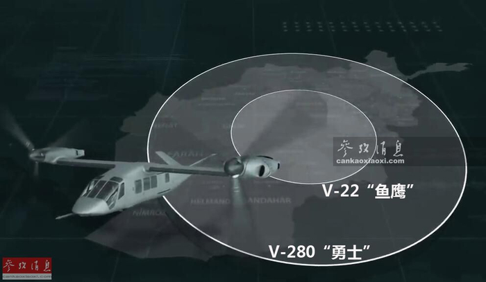 V-280最大平飞速度可超过每小时556公里(V-22仅为每小时446千米),最大作战航程可达1480千米(V-22仅为722千米),如果以美军部署阿富汗执行作战任务(均从首都喀布尔起飞)为例,V-22的航程(小圈)仅能覆盖周边几个省,而V-280(大圈)则几乎能覆盖阿富汗全境,后者在航程和反应速度方面的作战优势更为明显。