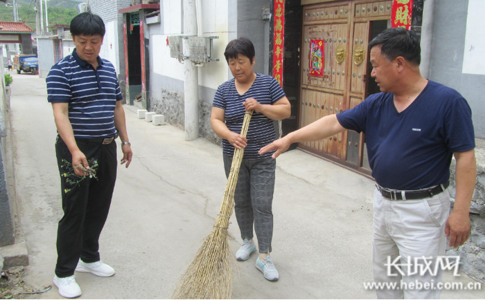 王春革(右一)、驻村帮扶干部和王春英(中)在商讨村里的卫生整治工作。 郭庆敏 摄