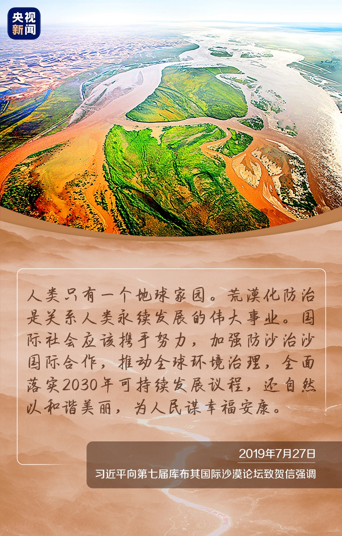 2017年和2019年,习近平先后向第六届、第七届库布其国际沙漠论坛致贺信。他在贺信中指出,中国高度重视生态文明建设,荒漠化防治取得显著成效。库布其沙漠治理为国际社会治理环境生态、落实2030年议程提供了中国经验。面向未来,中国愿同各方一道,坚持走绿色发展之路,共筑生态文明之基,携手推进全球环境治理保护,为建设美丽清洁的世界作出积极贡献。