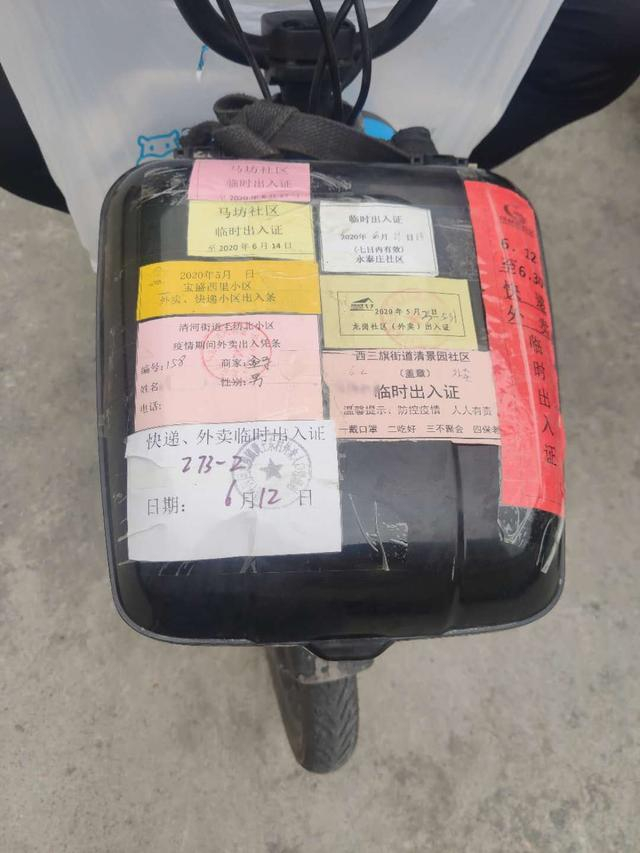 “出入小区又开始查证了!”盒马鲜生小营店的配送点外,两辆车筐上贴满五颜六色临时出入证的电动车很是吸引人。临时出入证内容各异,有的期限是一周,有的则长些;有的登记了姓名、电话、身份证号等信息。