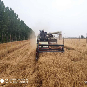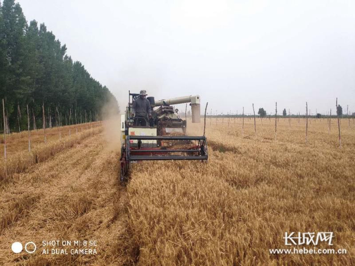 隆尧县永兴村优质麦种植区,联合收割机在收割小麦。