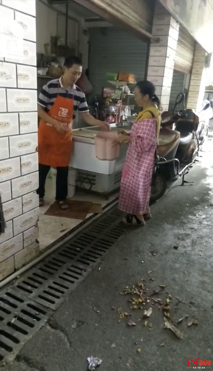 安姐提供给红星新闻记者两段视频,其中一段视频里叶大姐拿着一个小桶,在一个看起来像是农贸市场的地方,沿着商铺向商铺老板“化缘”。另一段视频里,叶大姐跪在地上,面前放着一个小桶,有人过来将钱扔进桶里。