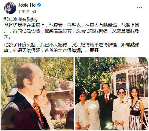 [环球网报道 记者 尹艳辉]港澳知名爱国企业家何鸿燊的女儿何超仪于父亲节前夕的6月20日,在脸书及微博发长文悼念病逝的父亲,并贴出多张自己的结婚照,回忆2003年父亲送她出嫁时的点滴,流露对父亲的思念。
