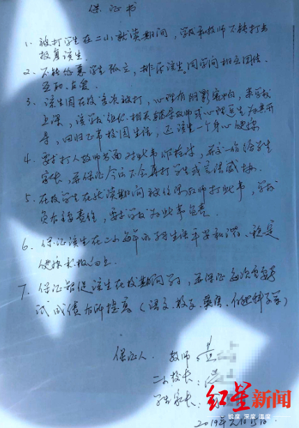“保证书”中,提到了“被打学生在(富春)二小就读期间,学校和教师不能打击报复”、“不能怂恿学生孤立、排斥该生”、“该生因在校多次被打,心理有阴影,害怕来学校上课”、“打人教师保证今后不会再打学生或言语威胁”等内容。