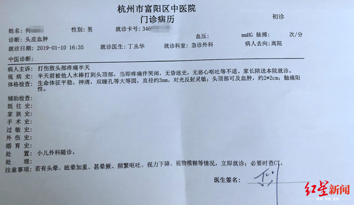 但去年1月10日,儿子回家后,楼女士发现儿子头上很大的包块。医院记录显示,小毅头顶部血肿大小约“2*2厘米”。夫妻俩称,他们从儿子口中得知,这是当天上语文课被班主任黄老师持击鼓棒打的。