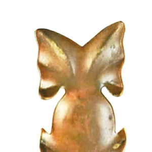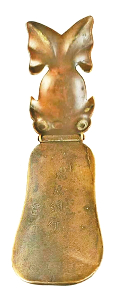 笔者藏有一只清末民初的黄铜鞋拔,长14厘米,上宽2厘米,下宽4厘米。鞋拔的上端雕刻有一尾活灵活现的金鱼,鱼腹紧鼓,鱼鳍高挺,鱼目外凸,鱼鳞清晰可辨,仿佛就要游走。这只鞋拔以鱼嘴为轴心,可以折叠起来。下方的直板形若牛舌,正面用精工雕绘出一幅“延年益寿图”。只见长须飘飞的寿星,左手捧着一只益寿仙桃,右手扶着挂有药葫芦的长寿拐杖,慈眉善目、神采奕奕。寿星身旁的仙鹤,体态雅致飘逸,引颈四望,展翅欲飞,让人不由想起古书中“鹤鸣于九皋,声闻于野”的精彩描述。鞋拔的背面非常简洁,除阴刻的“瑞记铜行”款印之外,没有一丝多余纹饰。