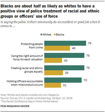 据美国皮尤研究中心今年6月公布的一项最新民调,相比白人群体,黑人群体对警察的信任度极低,黑人对警察的满意度不足白人的一半。