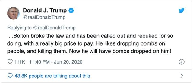 “他喜欢向人们投掷炸弹,然后杀死他们。现在会有炸弹投在他身上!”特朗普星期六在推特上炮轰约翰·博尔顿,但没有详细说明他建议或准备采取何种行动。