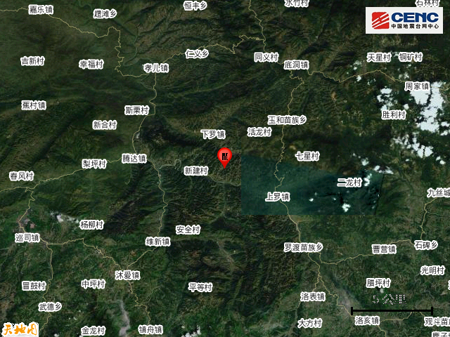 附近村镇:本次地震周边5公里内的村庄有石板垇、同乐村、洞底、湾滩、建华村、花树田、新建村、捻凼、大田坝、芭蕉坨,20公里内的乡镇有上罗镇、沐滩镇、中山乡、孝儿镇、罗渡苗族乡、沐爱镇、底洞镇、保平乡、洛亥镇、洛表镇。