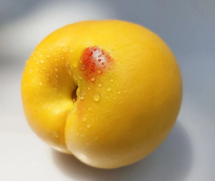 它属于桃中新贵,外皮和果肉都是金黄色的,和毛茸茸的黄桃不一样,黄金油桃无毛的表皮油光明亮,口感香甜,十分惹人爱~