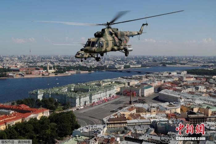 图为米-8军用直升机在城市上空飞行。