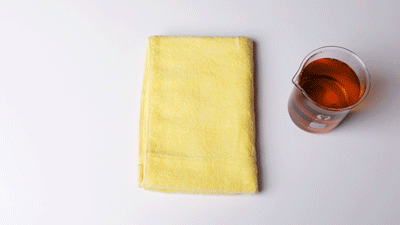 到底吸水量有多大呢?我们拿了一个500毫升的杯子,把水倒进毛巾上,全都吸收进去了,一点水都没有流出来。