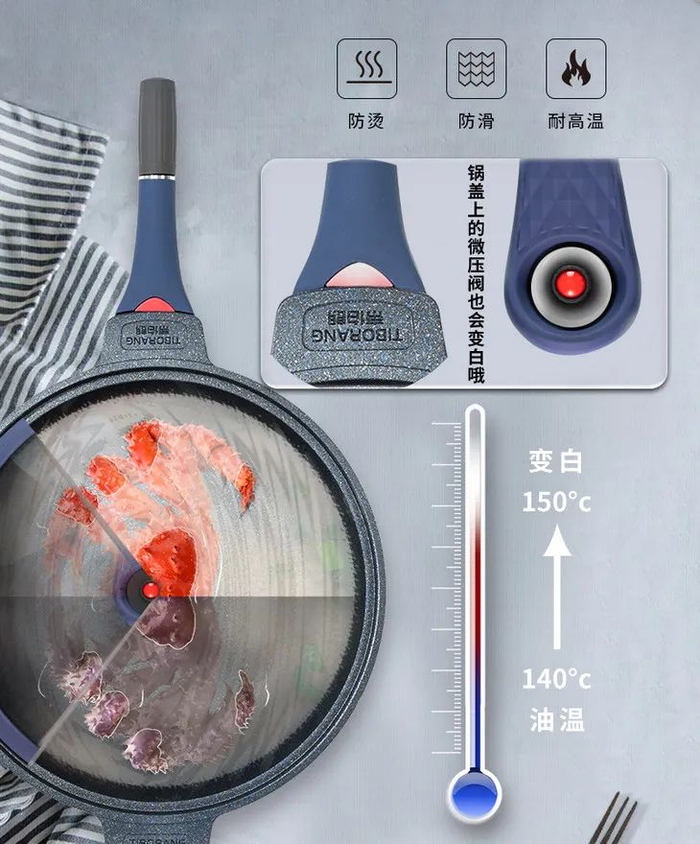 锅盖上、手柄上均设有感温点,只要锅内温度超过150℃,感温点就会由红变白,提醒你注意火候和防止烫伤。