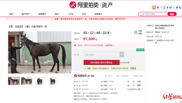 拍卖页面显示,监督单位是江苏省扬州市中级人民法院。扬州市中级人民法院新闻处工作人员告诉红星新闻,这也是扬州市首个活体拍卖。