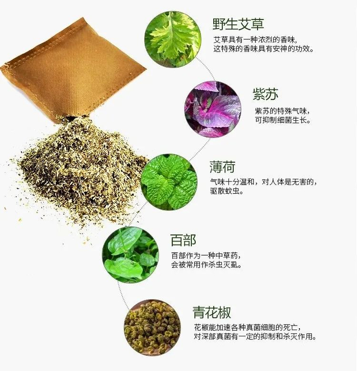 特配野生艾草、紫苏、薄荷、百部、青花椒等植物成分。