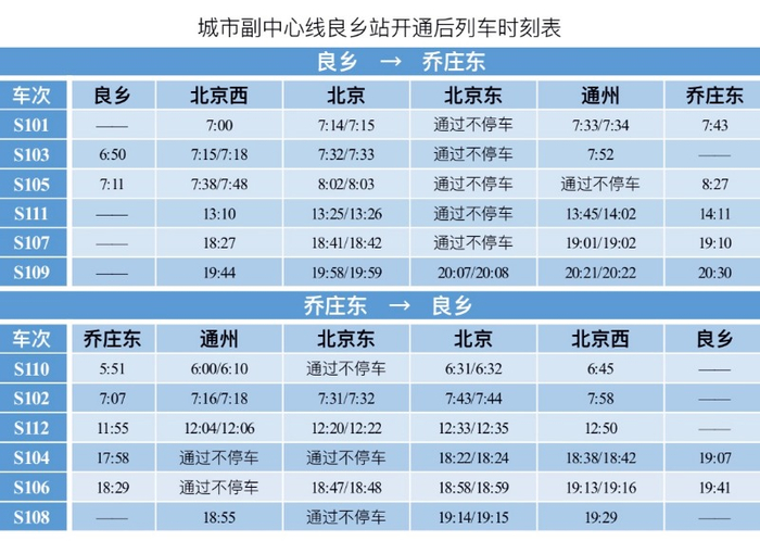 城市副中心线西延开通期,线路采用“京通号”CRH6A型电力动车组运行,全线仍维持日开行列车6对(12列)的方案。其中,每日早高峰开行2列从良乡站至乔庄东站方向的列车,晚高峰开行2列从乔庄东站到良乡站方向的列车。城市副中心线全程运行时间76分钟,其中良乡站至北京西站一站直达,最快25分钟。