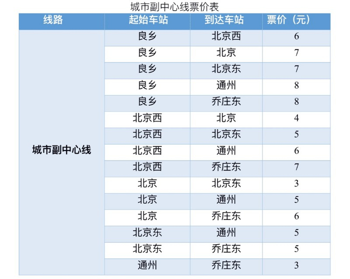 城市副中心线和通密线采用与城市轨道交通一致的票制票价,城市副中心线良乡站至乔庄东站全程票价8元,通密线通州西站至密云北站、通州西站至怀柔北站全程票价均为8元。