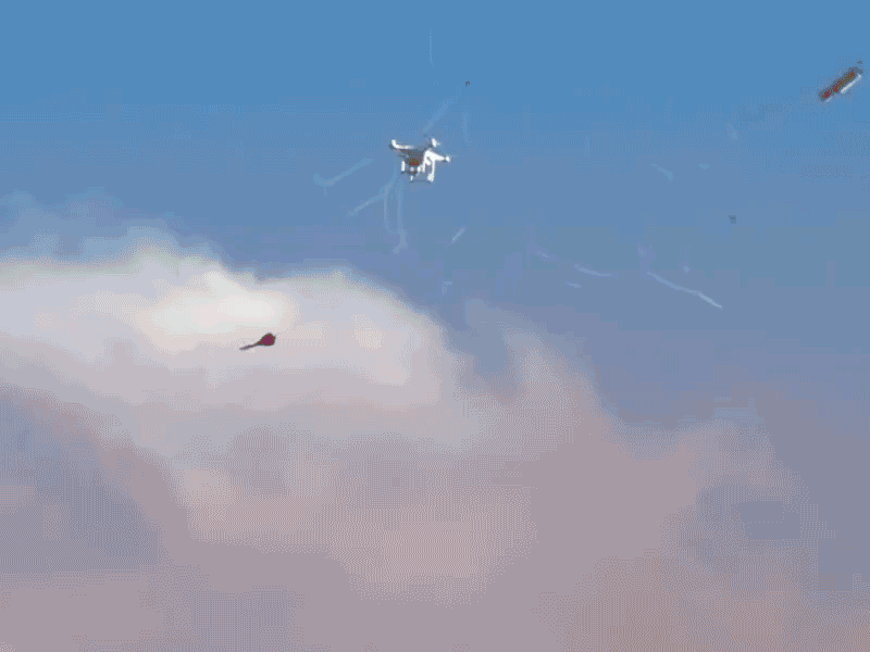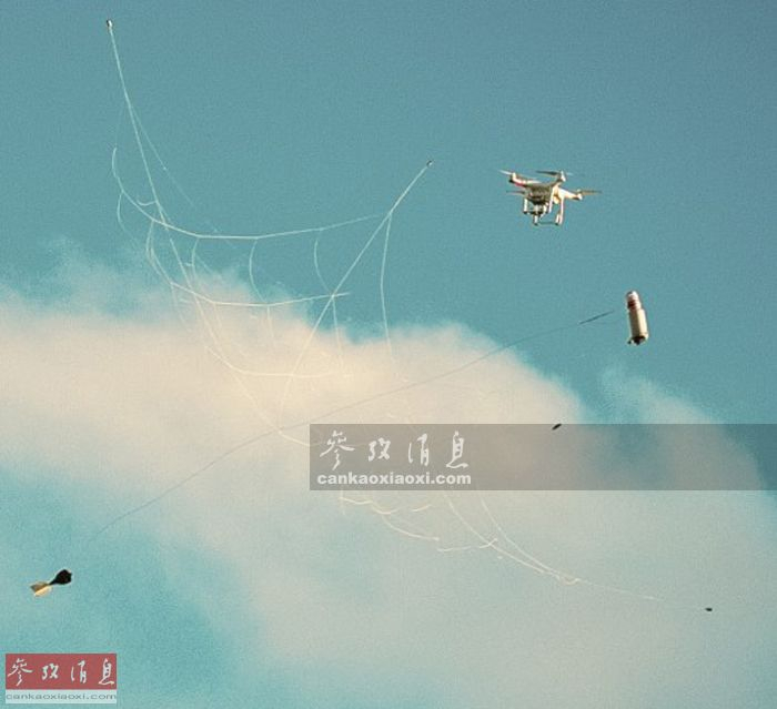 图为智能炮弹展开拦截网,捕捉无人机瞬间。