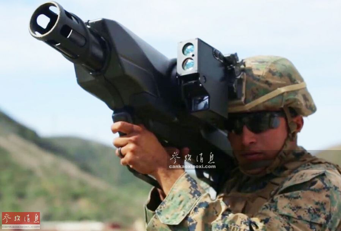 图为军演中,美海军陆战队员测试“天障”反无人机炮,图中可见该系统与M4卡宾枪的尺寸对比。