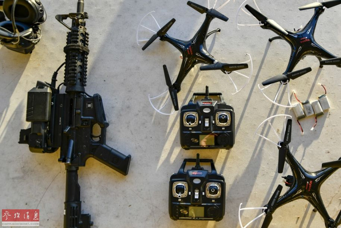 参与测试的加装有“智能射手”瞄具的M4卡宾枪,以及作为靶子的四轴无人机。