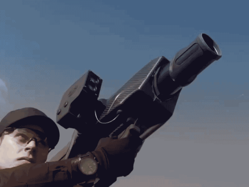 现实中的“天障”反无人机炮实际是一种以压缩空气推进的枪式发射器,配备有智能瞄准具。发射器全长1.3米,作战全重(含炮弹)10千克。图为美海军陆战队员试用“天障”防空炮,枪身后方是压缩空气罐。