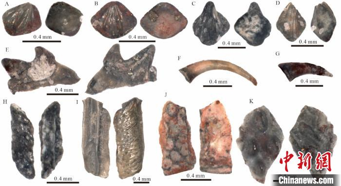 曲靖地区关底组Ⅱ段崇家湾段中的鱼类微体化石:A-E. 棘鱼类,其中A、B为栅棘鱼类背棘鱼未定种1,C为栅棘鱼类背棘鱼未定种2,D为栅棘鱼类背棘鱼未定种3,E为锉棘鱼类下颌;F-G. 硬骨鱼类牙齿;H-I. 硬骨鱼类斑鳞鱼鳞片;J. 无颌类不完整骨片;K. 盾皮鱼类不完整骨片。赵文金 供图