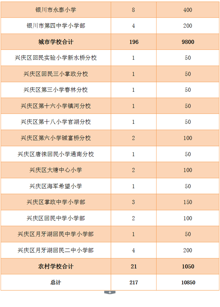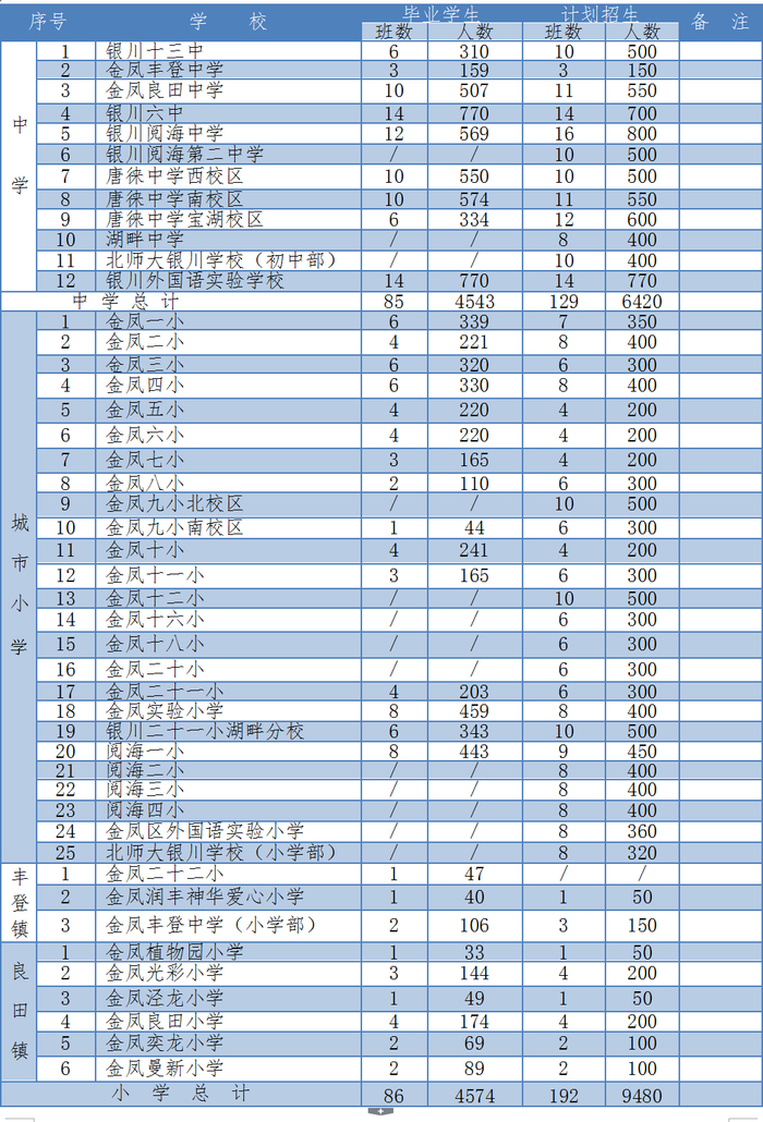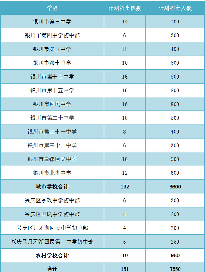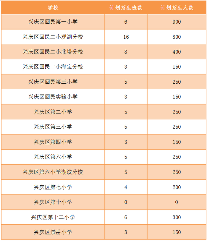 兴庆区公办小学计划招生217个班10850人,公办初中计划招生151个班7550人。民办小学计划招生22个班900人,民办初中计划招生20个班960人。