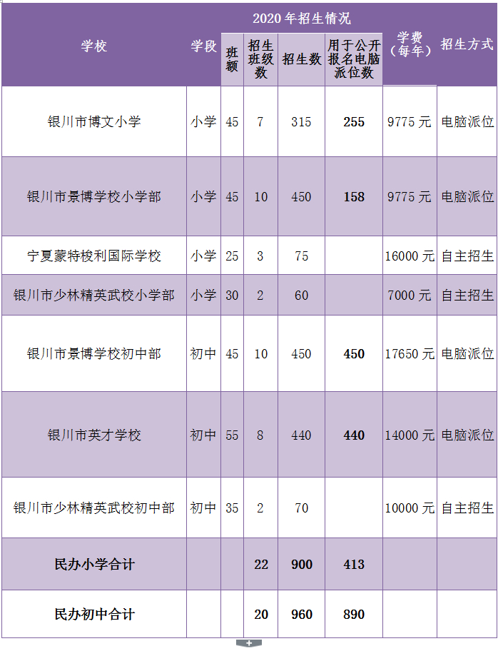 兴庆区2020年民办中小学生计划