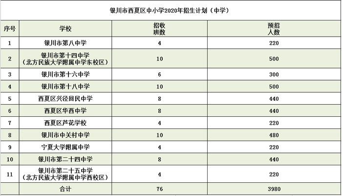 兴庆区2020年公办初中招生计划