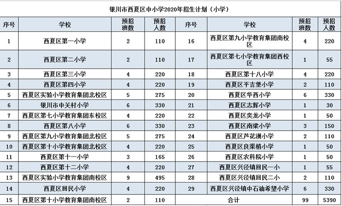 兴庆区2020年公办小学招生计划