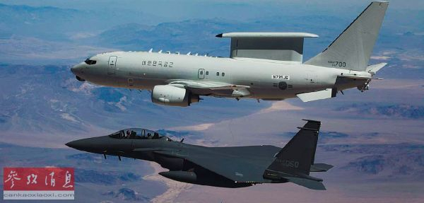 资料图片:一架韩军E-737预警机(上)与一架F-15K战斗机编队飞行。(美国《防务新闻》周刊网站)