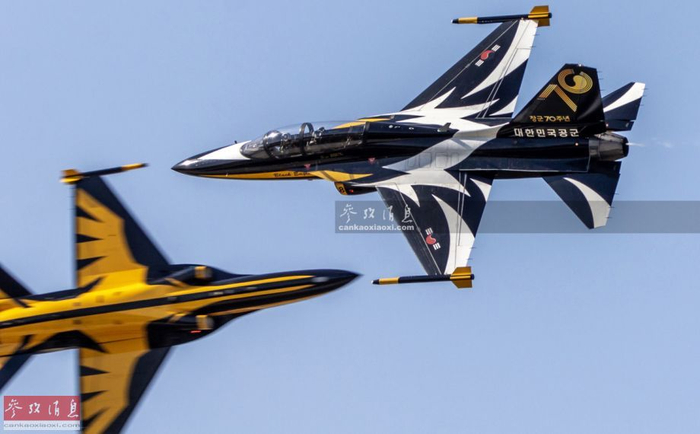 在航展上进行特技飞行表演的韩军“黑鹰”表演队T-50高级教练机,机身上的70图案为纪念韩国空军成立70周年。