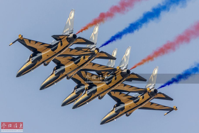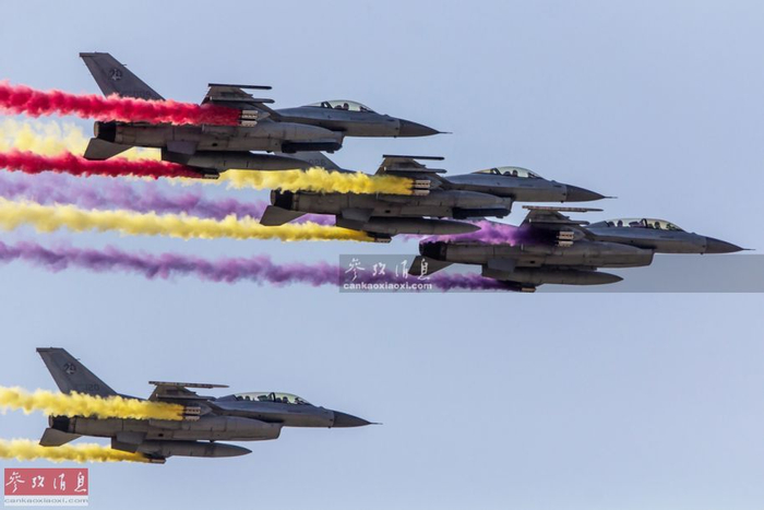 在航展上进行编队彩烟表演的韩军F-16战机。