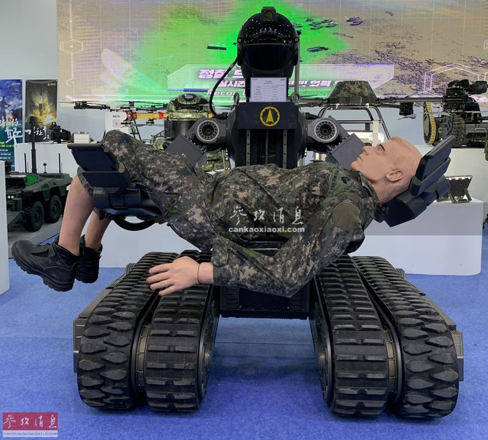首次参展的韩军国产无人排爆机器人,图中展示的是该型机器人还有搬运伤员的能力。