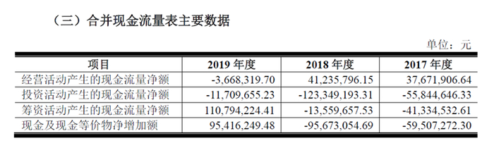 因此,从利润报表来看,仅仅实现了一年营收净利同比正增长的瑞华股份,其盈利能力还远远说不上稳定。更不乐观的数据出现在了其现金流量表中,在营收和净利润增长显著的2019年,瑞华股份的经营活动产生的现金流量净额却为负数,达到-366.83万元,2019年每股经营活动产生的现金流量同样也为负数,为-0.03元。