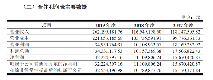 从招股书中公布的营收利润情况来看,瑞华股份的营收和利润,在2019年才实现了同比正向增长,营业收入2.62亿元,净利润3222.44万元。而在2018年,这两项业绩同比都有所下降,2018年营业收入1.17亿元,较2017年的1.18亿同比略降0.85%;净利润1110.98万元,较2017年的1567.04万元同比下降29.10%。