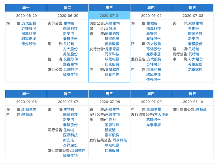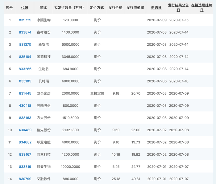一波精选层新股密集申购——7月1日至9日,包含上述两股在内,贝特瑞(835185.OC)、新安洁(831370.OC)等14只股开启申购,其中7月2日、3日均有3只新股、7月8日有4只新股。