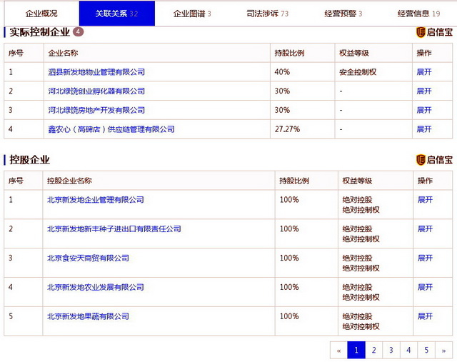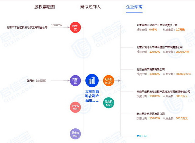 启信宝信息显示,新发地市场控股或持股企业从北京新发地企业管理有限公司、北京食安天商贸有限公司、北京新发地农业发展有限公司,到中土特农业发展(海南)有限公司,总数多达126家。有9家企业的绝对控股、绝对控制权。