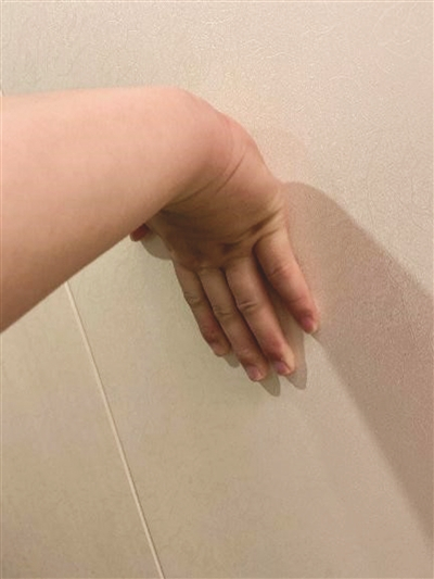 将患侧手臂伸直,指尖顶墙,身体重心向前,使患侧手腕尽量背伸,在背伸极限位置每组坚持15~30秒。