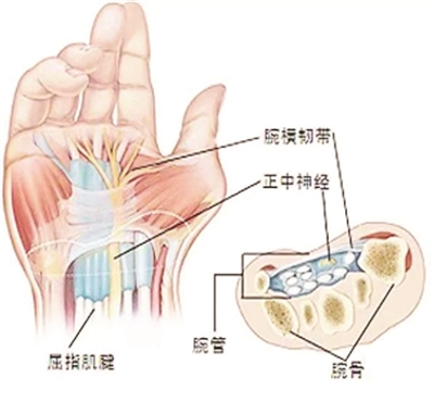 腕管(如图):由屈肌支持带(腕横韧带)与腕骨沟共同构成。管内有指浅、指深屈肌腱及屈肌总腱鞘、拇长屈肌腱及其腱鞘和正中神经通过。正中神经在腕管内变扁平,紧贴屈肌支持带桡侧端深面,腕骨骨折时可压迫正中神经,导致腕管综合征。