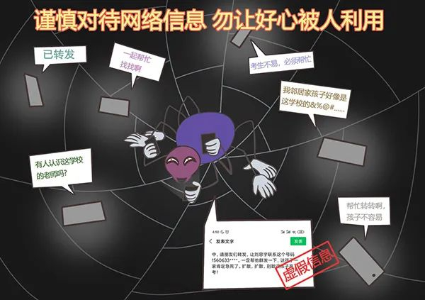 2019年高考开考前夕,微信群、朋友圈等网络平台流传着一则虚假信息,声称“捡到一张高考准考证,刘思宇,考点在实验高中,请朋友们转发,让刘思宇联系这个号码1560633****。一定帮他群发一下,这孩子一家肯定急死了。扩散,扩散,别耽误孩子高考!”从2016年“白娅倩”、2017的“杨雷雷”“孙超”“党喜龙”、2018年“刘明炜”“刘明婷”等同学到2019年的“刘思宇”,年年丢失准考证,内容如出一辙,套路依旧。