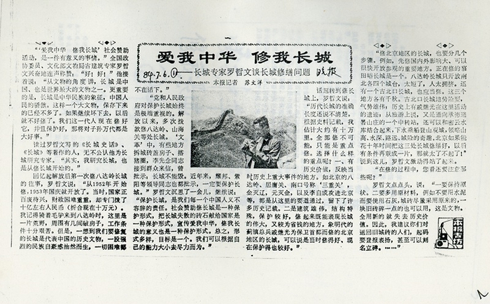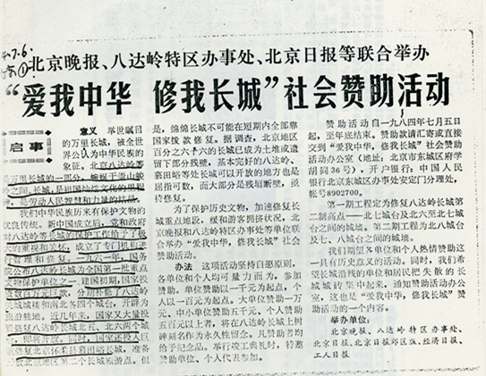 今天,“长城修缮文献数字展”同步上线,展览分为“缘起:长城重点地段亟待修缮”、“认可:中央领导题词支持”、“凝聚:社会各界踊跃参与”、“成果:八达岭长城重点地段修缮完成”、“今昔:八达岭长城修缮前后对比”、“铭记:‘爱我中华,修我长城’捐赠名单及相关纪念品”6个板块,以“云展览”形式,展示文献资料、历史照片、档案手迹等珍贵史料,再现1984年八达岭特区办事处与《北京日报》《北京晚报》等单位共同发起的“爱我中华,修我长城”社会赞助活动的方方面面。