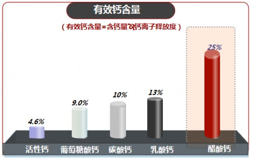 其实选择补钙产品并不像大家想象的那么复杂,最主要的还是要看含钙量。有效钙含量=含钙量X钙离子释放度,有效钙含量即最终参与钙吸收的钙离子的含量!醋酸钙是有效含钙量最高的钙。醋酸钙的有效含钙量是25%,其他的活性钙、葡萄钙、碳酸钙、乳酸钙等都没有醋酸钙有效含钙量高。另外,金丐醋酸钙的成分属于有机钙,有较好的水溶性,有效含钙量高达25%,是溶解度最高的钙。能有效促进钙吸收,补钙效果更好。