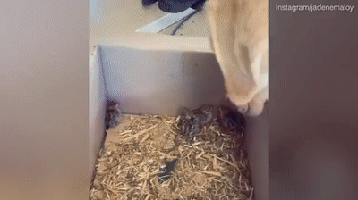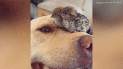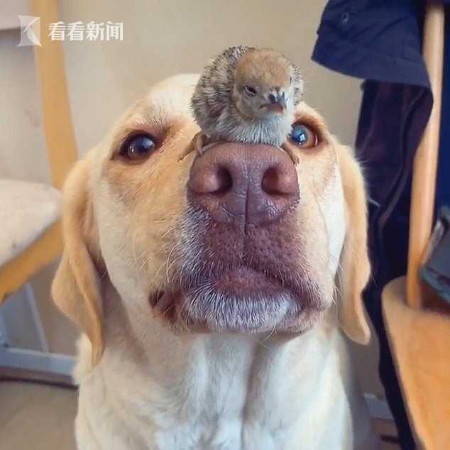 令人惊喜的是,她的宠物犬"鲁比"看到这3只鹧鸪苗后立刻着了迷,而鹧鸪苗们似乎也一点都不害怕面前的这个大家伙。在随后的日子里,拉布拉多犬几乎与鹧鸪苗形影不离,一会儿母爱爆棚,走进纸箱里将鹧鸪苗们揽在怀里取暖;一会玩性大发,将鹧鸪苗们顶在鼻子,甚至嘴巴上玩的不亦乐乎。主人莫洛伊当然不会错过这样的镜头,她将这一充满温馨有趣的画面一一记录下来,发到社交媒体上。