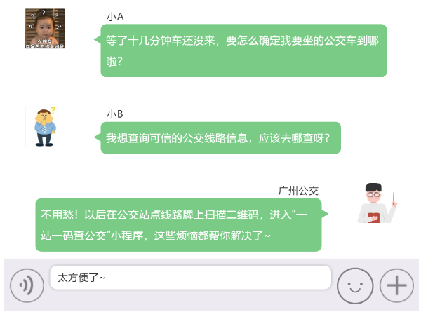 除了通过搭载的小程序上三大服务功能解决乘客候乘需求外,广州公交集团还作出“一站一码查公交”的设计,即每个流向的公交候乘点主站名对应独一无二的、具有唯一物理定位的二维码,扫码即精准定位所在站点,即时显示当前站点线路信息。且公交车辆动态信息由公交调度系统提供,权威可信,解决了以往公交查询软件信息不准确、形象不明确的情况,大幅节省市民查询时间。