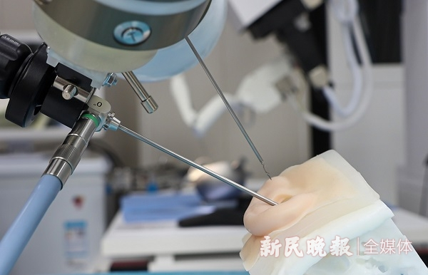 图说:“微耳”手术机器人具有定位准确、无抖动、高精度的特点 新民晚报首席记者 刘歆 摄(下同)